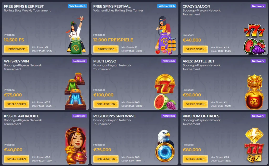 Preispools werden unter den Top-Performern verteilt, und die Belohnungen können Bargeldpreise, Freispiele oder einen speziellen RollingSlots-Bonus umfassen, der an das Thema der Veranstaltung gebunden ist. Einige Turniere finden saisonal statt, während andere wöchentlich oder monatlich abgehalten werden.